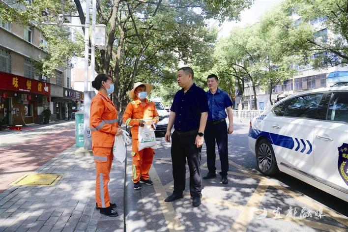 宜都市城市管理执法局党组书记、局长黄志华(右二)为环卫工人“送清凉”