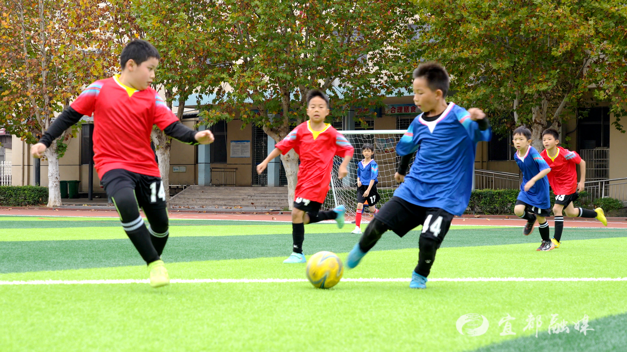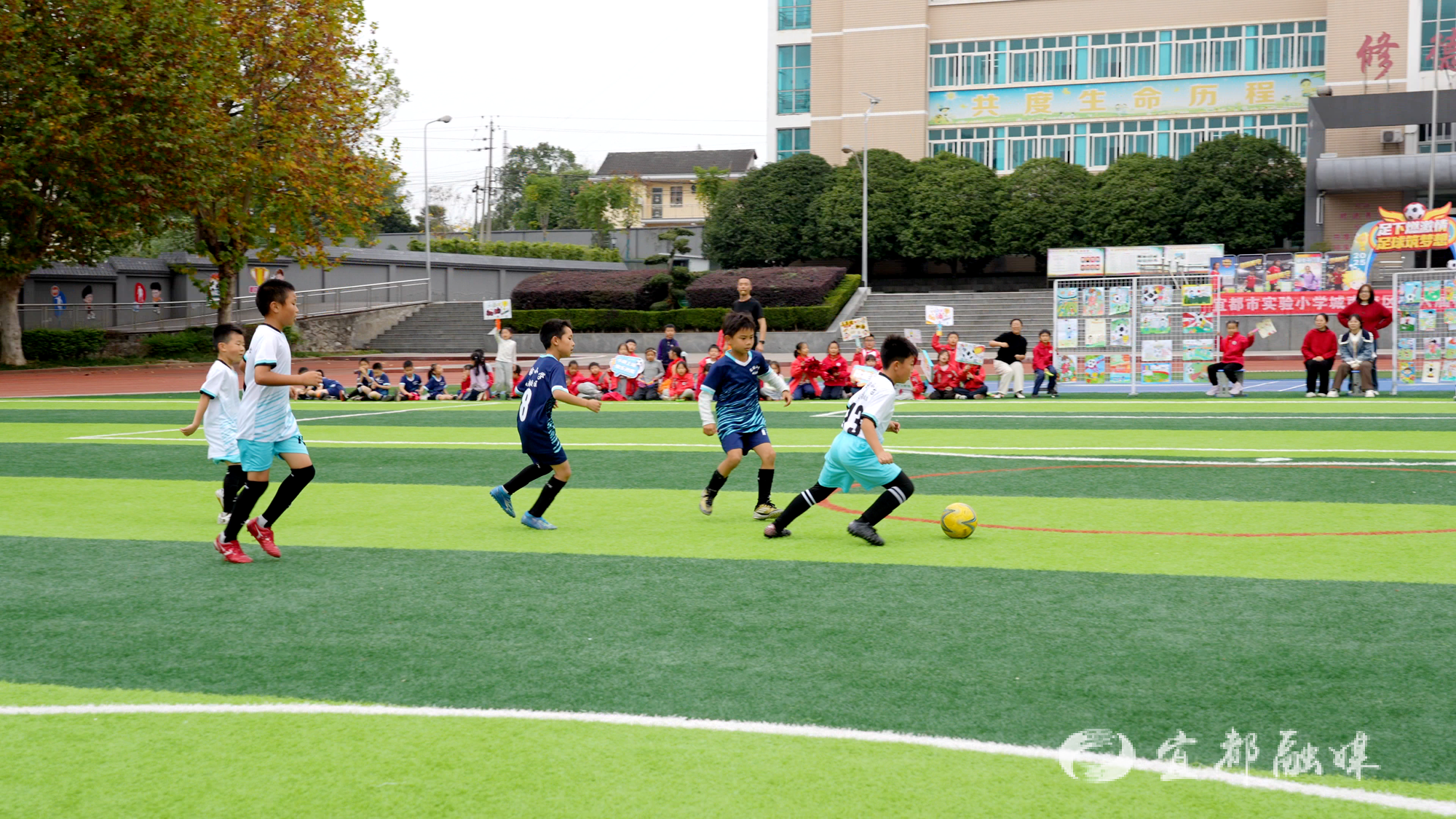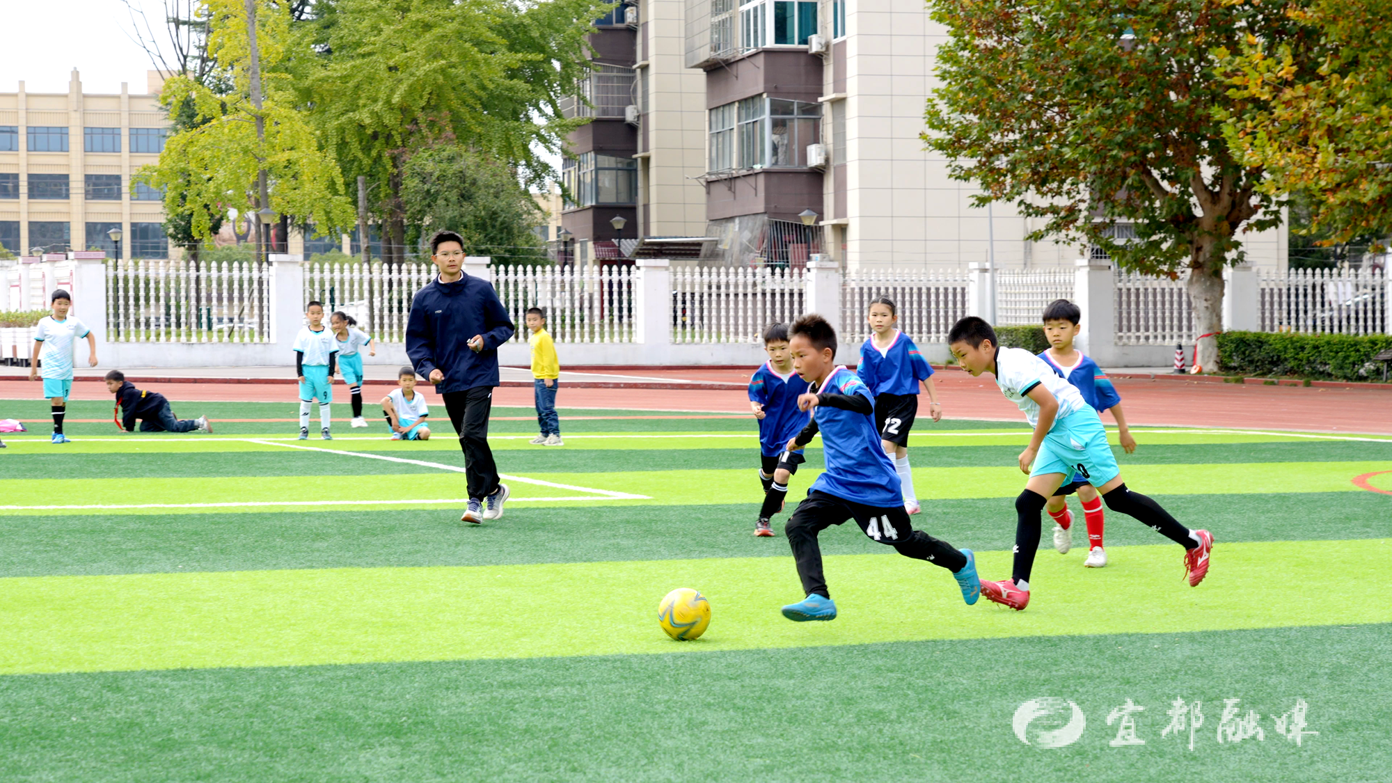 实验小学城南校区德育副校长张翠介绍:“我们配齐专业教练团队,建强标准化场地,将足球运动全面融入阳光体育大课间、课堂教学与校园联赛,让每个孩子都能尽情跑起来,快乐踢起来!未来,我们将持续擦亮足球特色品牌,让绿茵场成为孩子们成长路上最鲜活、最亮丽的底色。”