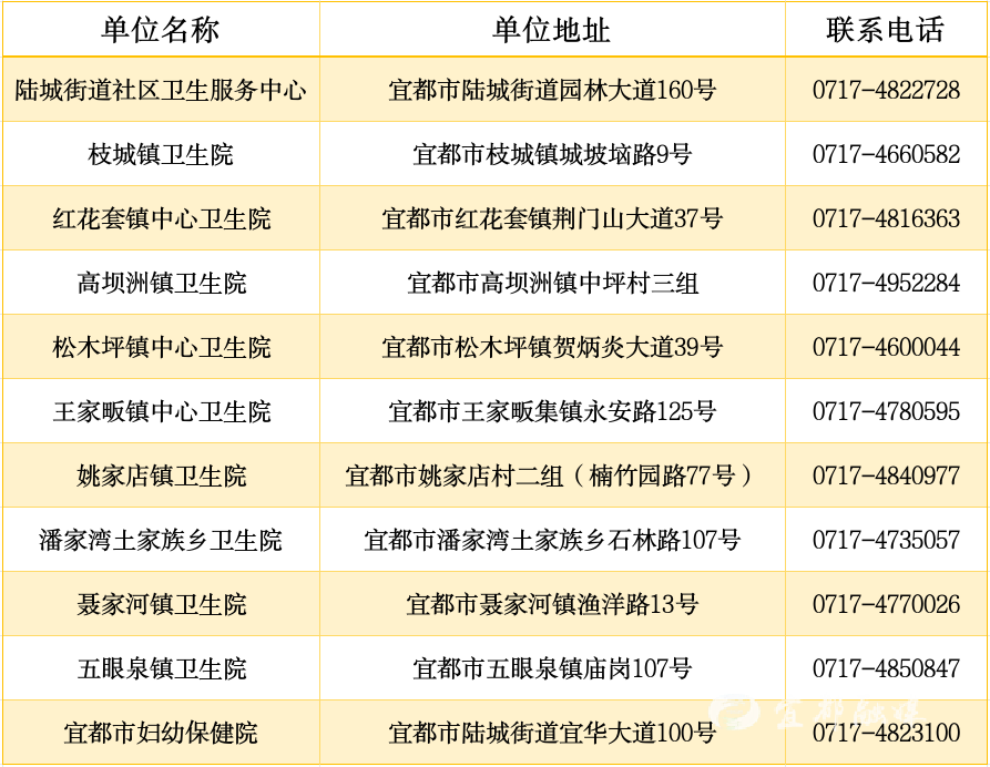 宜都市预防接种门诊一览表