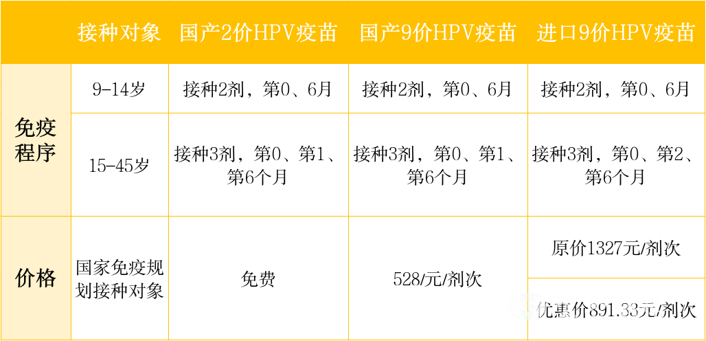国家免疫规划HPV疫苗为国产双价HPV疫苗,实行免费接种,按照知情、自愿的原则,也可自行选择、自费接种其他类型的双价、四价、九价非免疫规划HPV疫苗替代,既往接种过HPV疫苗人员,无需再接种。本市提供HPV疫苗选择如下表: