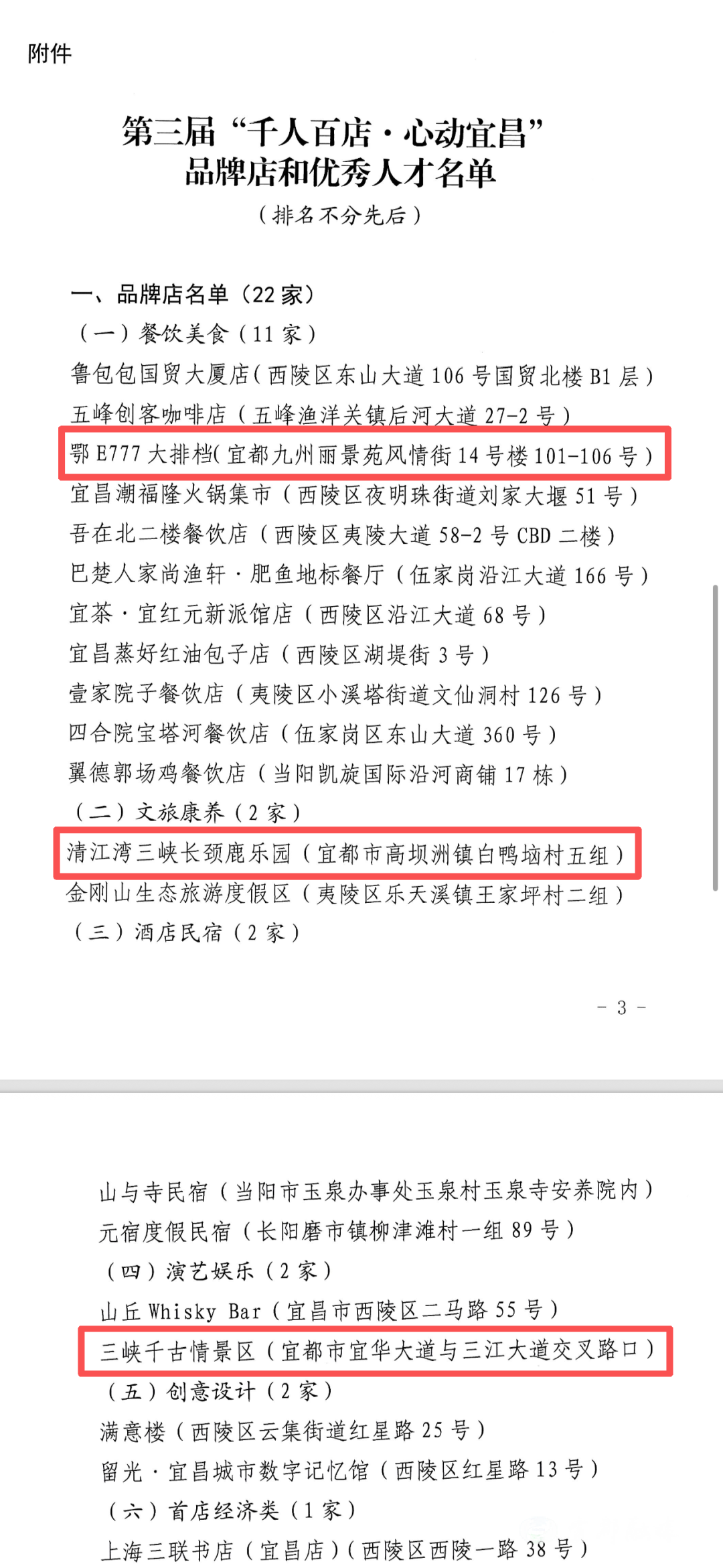 宜都融媒讯 3月30日,第五届“330”三峡人才日在宜昌城区举行,现场公布第三届“千人百店・心动宜昌”品牌店与优秀人才名单,我市三峡千古情景区、清江湾三峡长颈鹿乐园、鄂E777大排档、郭世佳、尹久力(自媒体账号:久久归宜)成功入选。