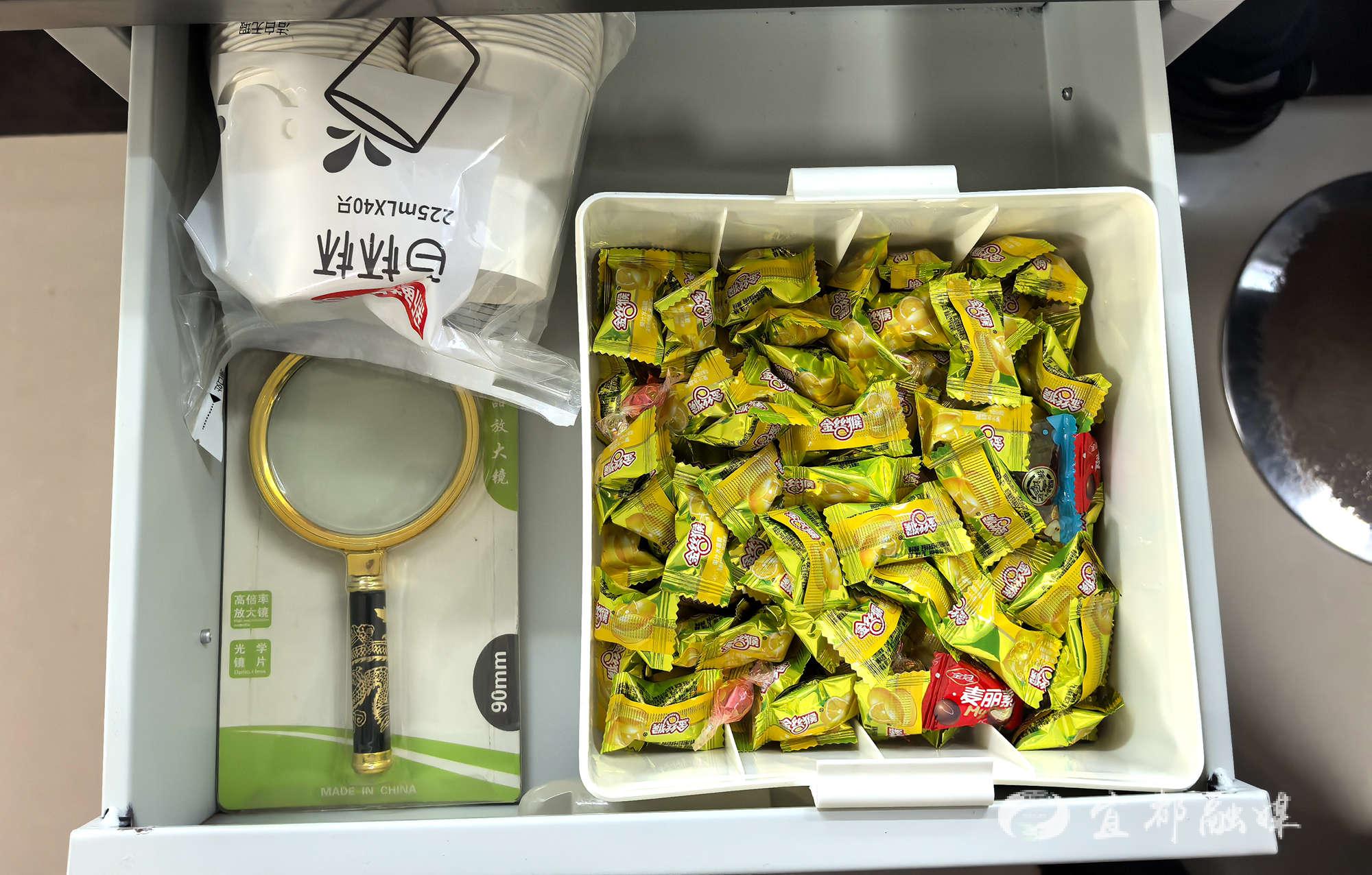 更贴心的是,工作人员在储物柜抽屉内配备了多种“暖心小物件”:一次性饮水杯方便空腹体检群众抽血后及时补水,便民放大镜助力视力不佳的老年人看清资料,一盒水果糖则专门为可能出现低血糖或空腹时间较长的群众准备。