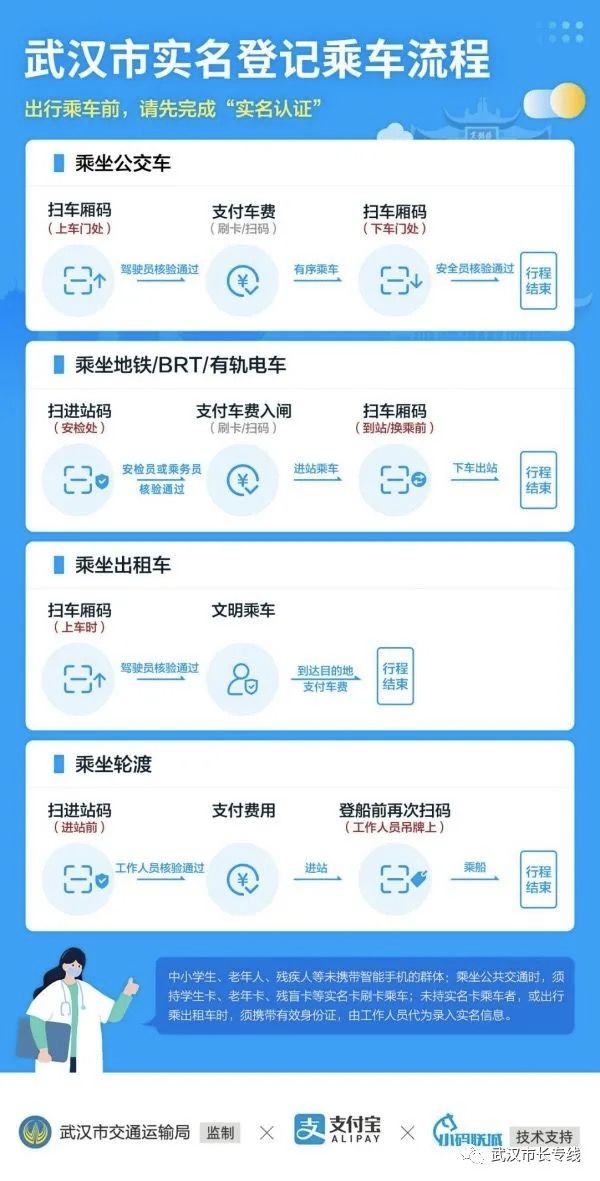 市民在市内乘坐公共交通工具出行前,须获取湖北省健康码“绿码”。乘坐公共交通工具时,须扫描“武汉市实名登记乘车(船)二维码”,系统会自动上传乘车(船)信息。
