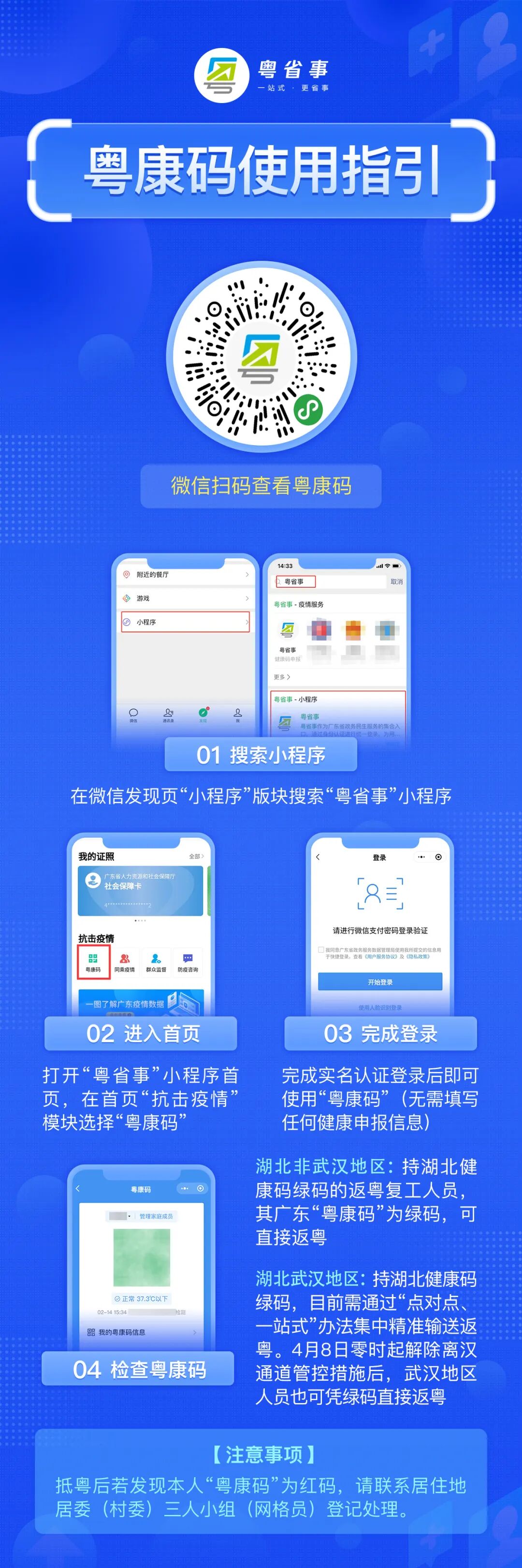 3月26日,广东省“粤省事”政务服务平台发布信息,告知广大湖北赴粤返岗人员:从4月8日零时起,解除离汉通道管控措施后,武汉地区人员也可凭绿码直接返粤。尚在湖北的计划返粤人员,也可在当地同步申请广东省“粤康码”。