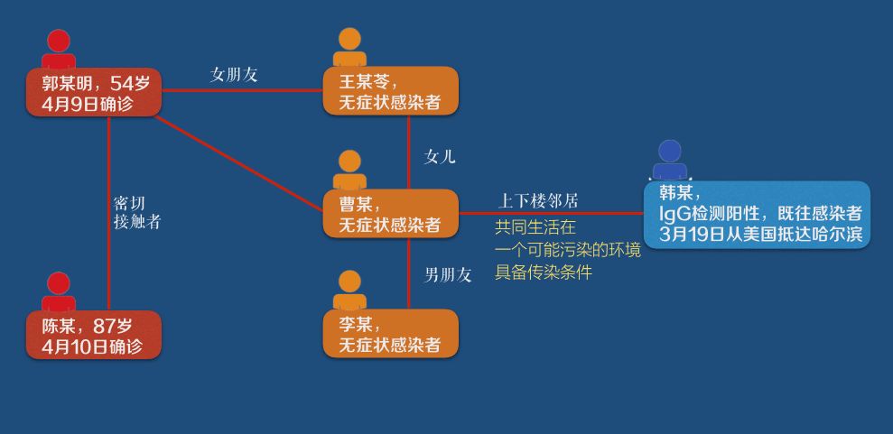 4月10日,哈尔滨又新增1例确诊病例陈某,为郭某明的密切接触者。五人发病前两周均无武汉、湖北、其他有病例持续传播地区及境外旅行史或居住史。郭某的感染源一时成谜。