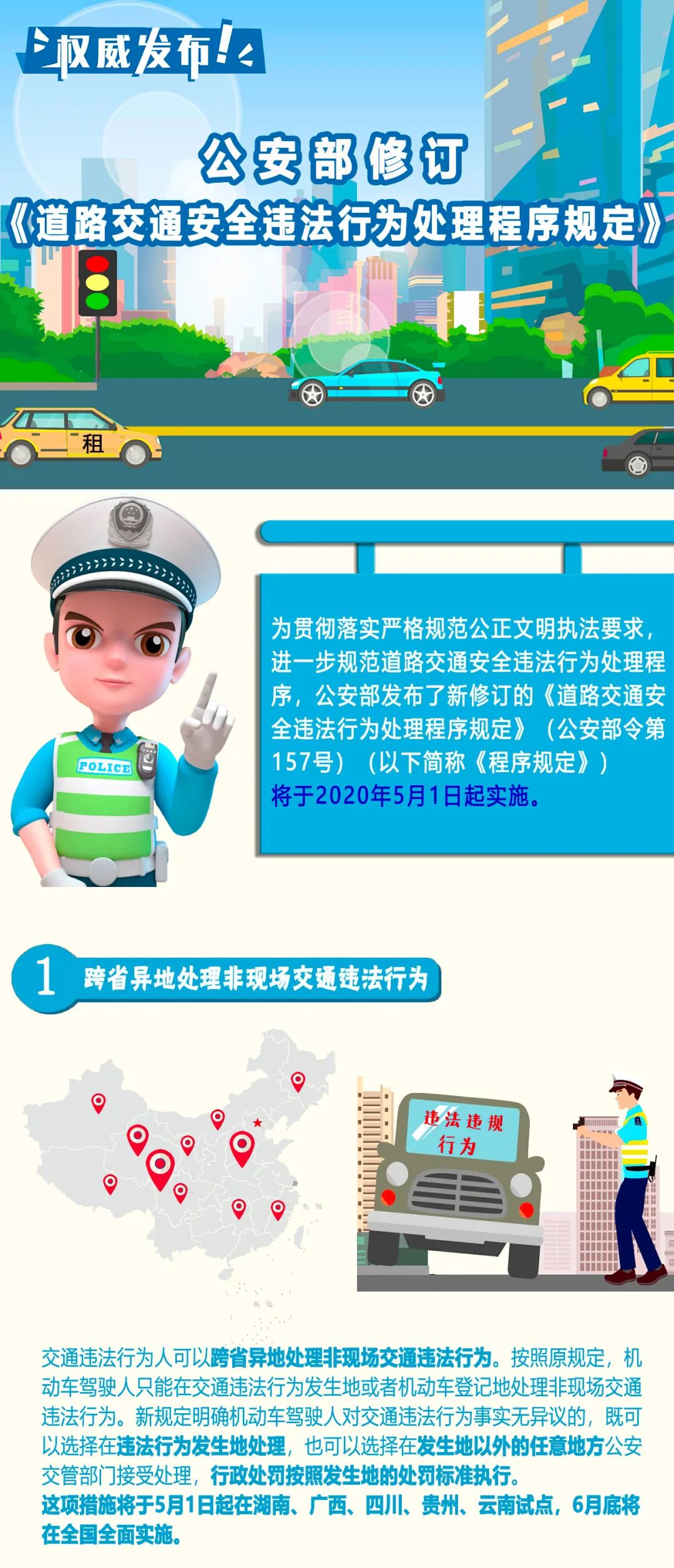 为贯彻落实严格规范公正文明执法要求,进一步规范道路交通安全违法行为处理程序,近日,公安部修订了《道路交通安全违法行为处理程序规定》(公安部令第157号),新《程序规定》将于2020年5月1日起正式实施。