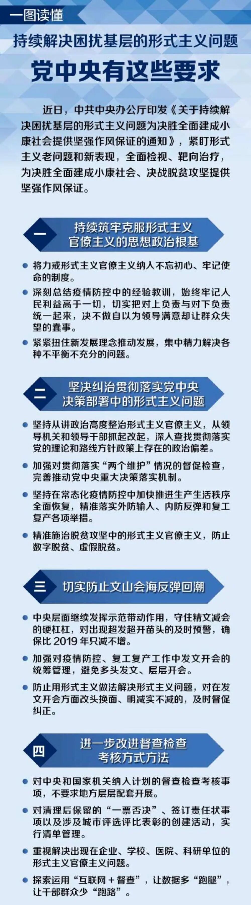三、切实防止文山会海反弹回潮。中央层面继续发挥示范带动作用,守住精文减会的硬杠杠,对各地区各部门发文开会情况实施动态监测,对出现超发超开苗头的及时预警,确保比2019年只减不增。加强对疫情防控、复工复产工作中发文开会的统筹管理,避免多头发文、层层开会。既要严格控制向县级以下发文的数量,又要精减基层向上级报文报表的数量。着力提高文件、会议质量,进一步明确精文减会的标准和尺度,完善负面清单,不发不切实际、内容空洞的文件,不开应景造势、不解决问题的会议,做到真减负、减真负。防止用形式主义做法解决形式主义问题,对在发文开会方面改头换面、明减实不减的,及时督促纠正。