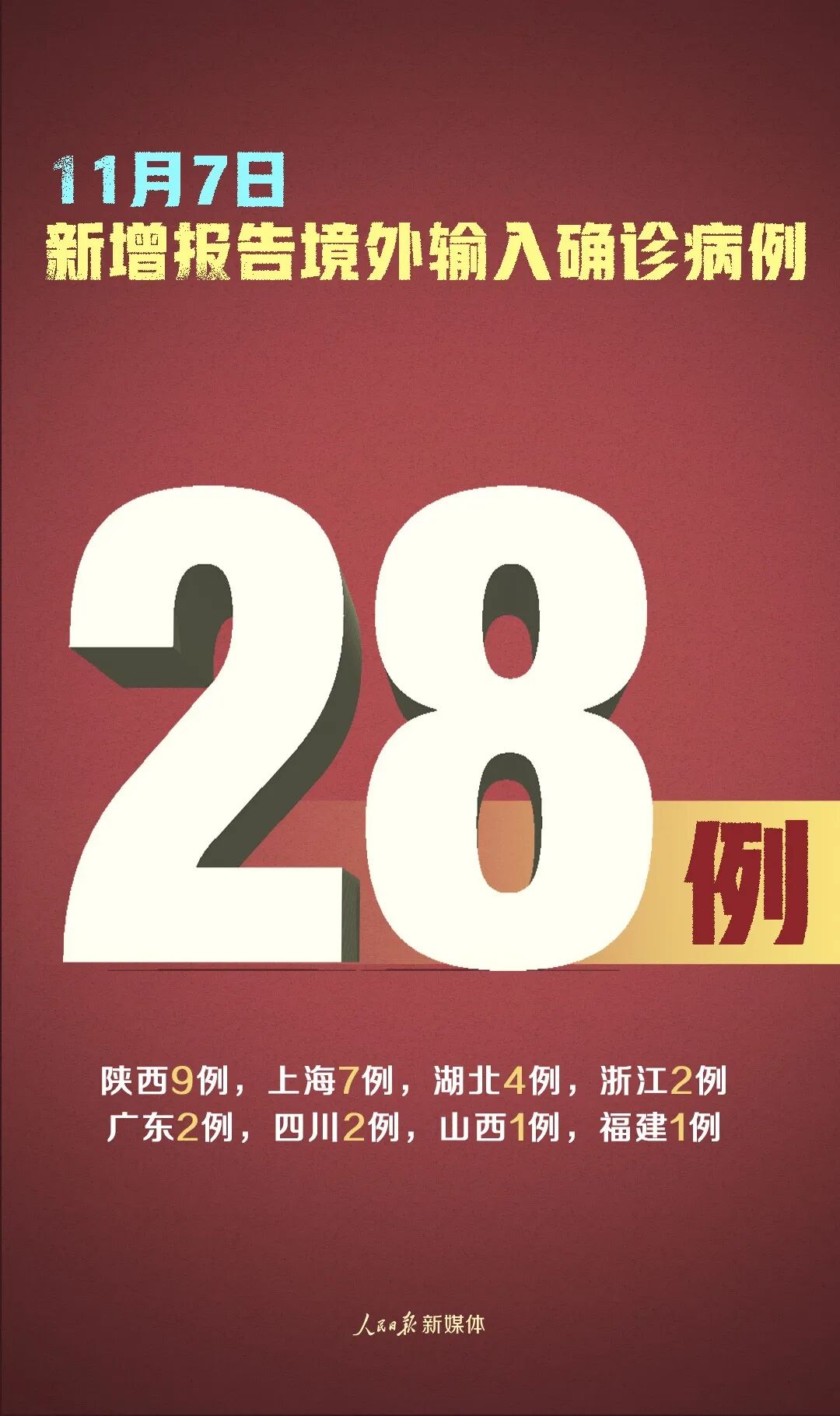 11月7日0—24时,31个省(自治区、直辖市)和新疆生产建设兵团报告新增确诊病例28例,均为境外输入病例(陕西9例,上海7例,湖北4例,浙江2例,广东2例,四川2例,山西1例,福建1例);无新增死亡病例;新增疑似病例4例,均为境外输入病例(均在上海)。