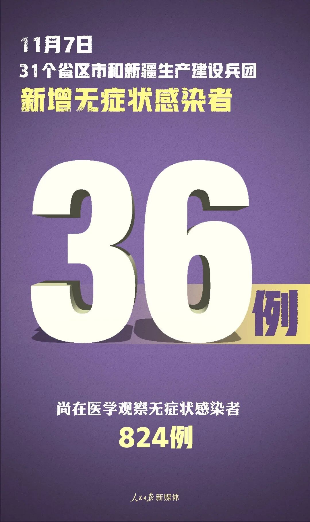 31个省(自治区、直辖市)和新疆生产建设兵团报告新增无症状感染者36例(境外输入34例);当日转为确诊病例3例(均为境外输入);当日解除医学观察32例(境外输入18例);尚在医学观察无症状感染者824例(境外输入508例)。