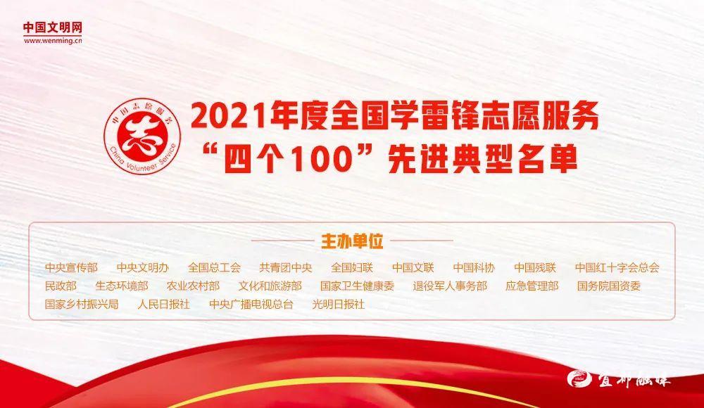 2021年10月至2022年3月,中央宣传部、中央文明办等部门和单位共同组织开展了2021年度全国学雷锋志愿服务“四个100”先进典型宣传推选活动,宣传推选出了100个最美志愿者、100个最佳志愿服务组织、100个最佳志愿服务项目和100个最美志愿服务社区。