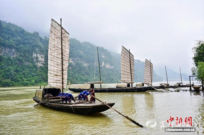 “伙计们,上青滩呐——”高亢的峡江号子响起,船工们声声应和,粗粝的嗓音裹着江风,旧时峡江船只闯险滩、越激流的景象跃然眼前。
