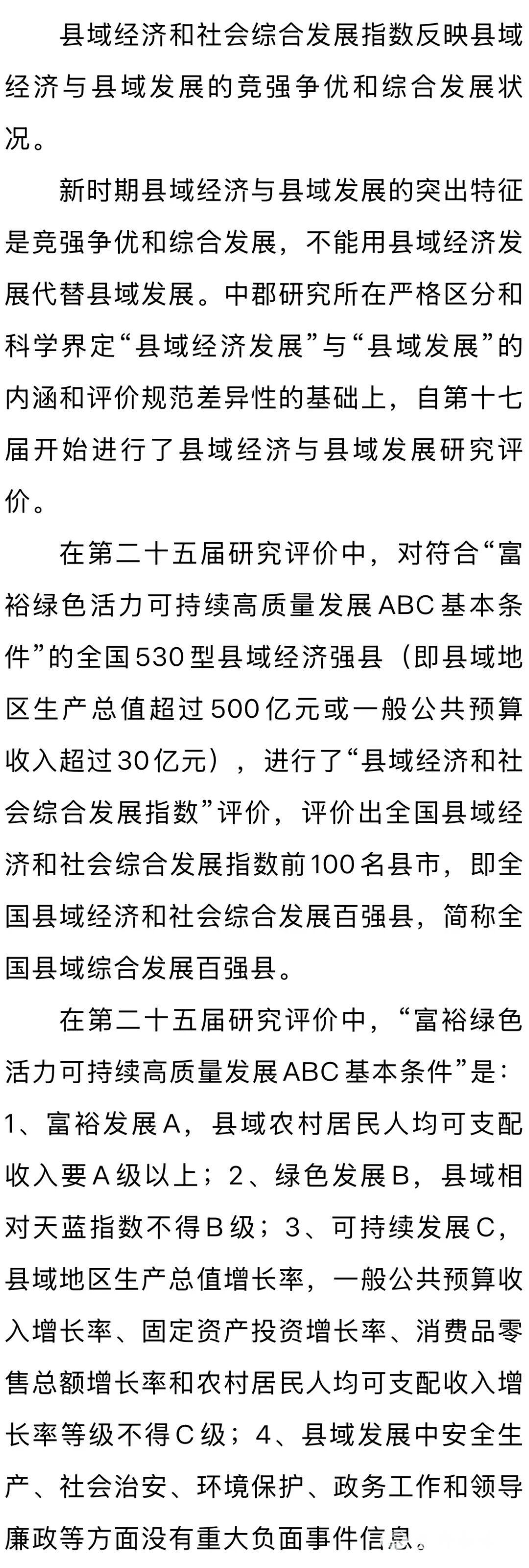 《报告》以“强县富民一体发展”为主题,监测评价出第二十五届县域经济基本竞争力百强县、第二十五届县域现代化高质量发展A+优等级县市以及第二十五届县域经济和社会综合发展百强县。《报告》详细内容请浏览中郡县域经济网·县域经济大数据开放平台WWW.CHINA-COUNTY.ORG。