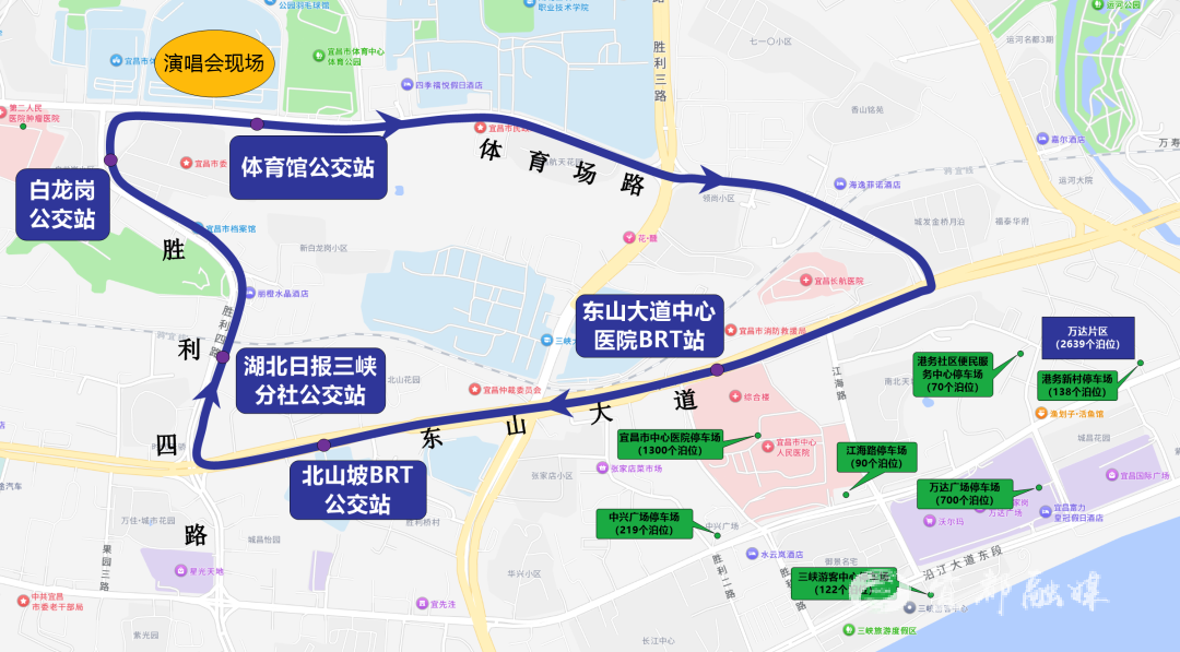 途经站点:东山大道中心医院BRT公交站→北山坡BRT公交站→湖北日报三峡分社公交站→白龙岗公交站→体育馆公交站→返回中心医院BRT公交