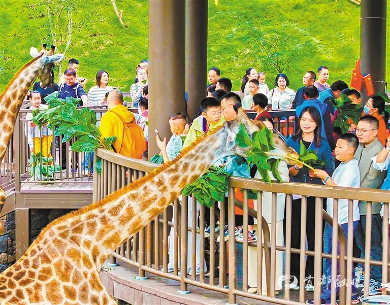 5月1日,游客在清江湾旅游度假区的三峡长颈鹿乐园与长颈鹿互动。 刘传东摄(中经视觉)