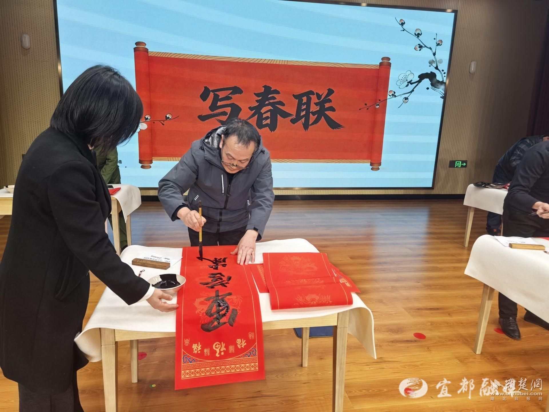 荆楚网(湖北日报网)讯(通讯员 常梦星)“这副春联写得好!‘马不停蹄兴百强宜都,兵怀赤胆护文明故土’,横批‘国泰民安’,写出了咱们老兵保家卫国、建设家乡的共同心声!”1月9日下午,在宜都市退役军人事务局举办的“翰墨抒军魂 选联贺新春”主题活动现场,老兵周国平手指着展示的春联,激动之情溢于言表。春节临近,百余名退役军人代表欢聚一堂,活动现场暖意融融,墨香四溢,以春联这一传统民俗为载体,共叙深厚战友情,齐迎甲辰新春。