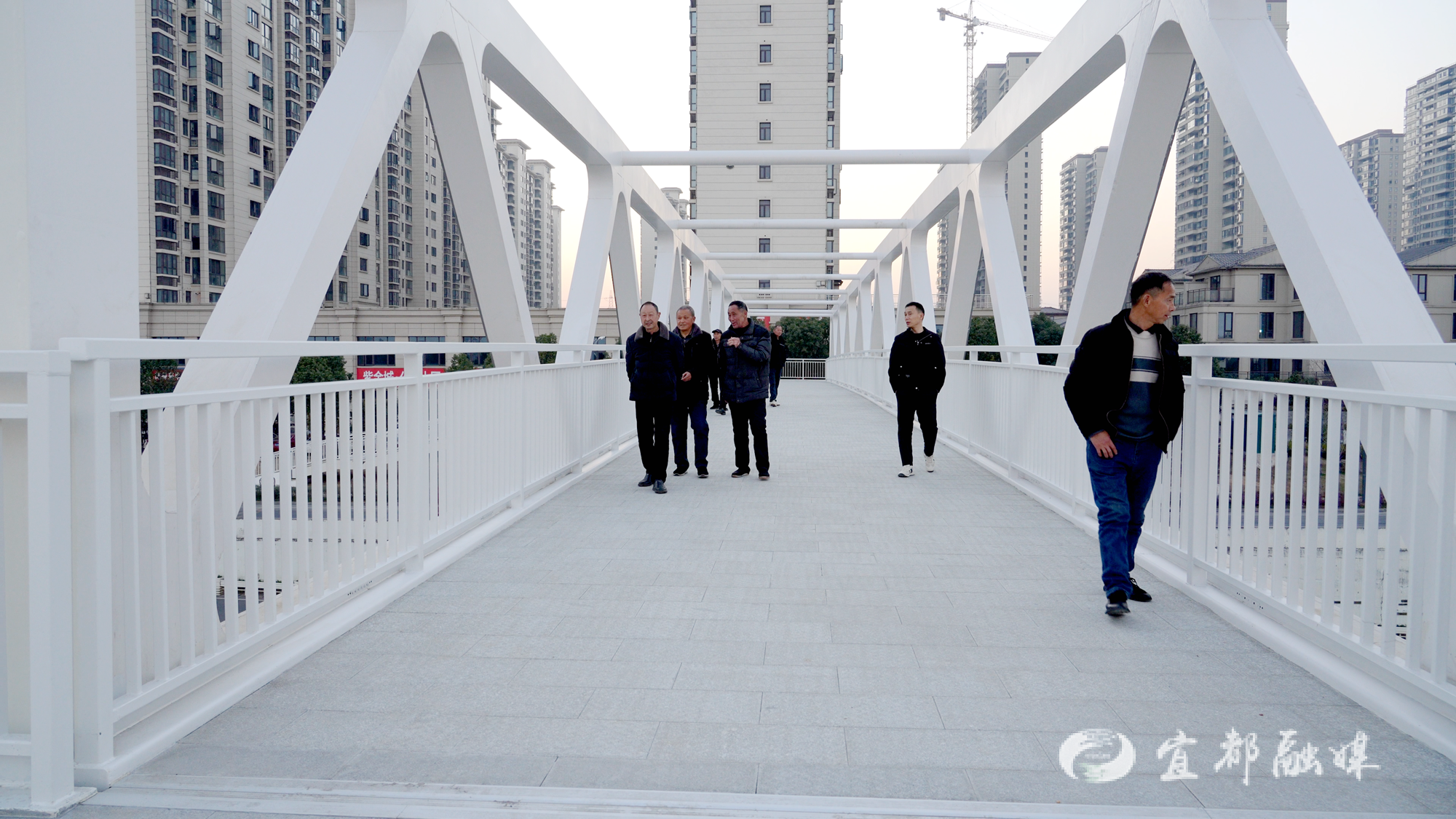 宜华大道人行天桥位于宜都府小区东侧,采用钢桁架结构,主桥全长57.15米,单跨达50米,两端均配备梯道与坡道。天桥投用当天,不少周边居民率先体验,通行秩序井然。