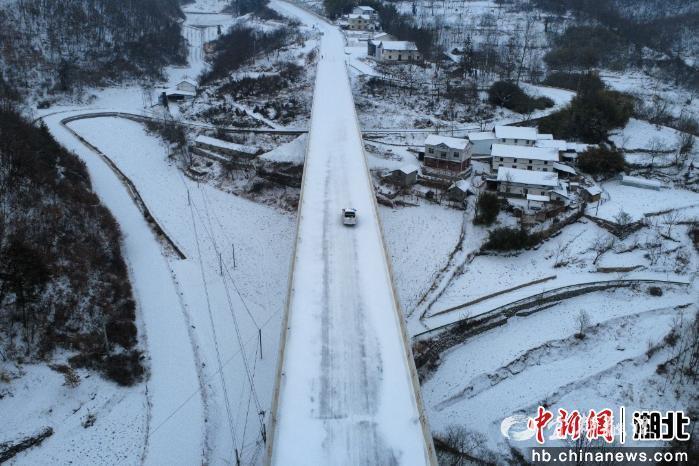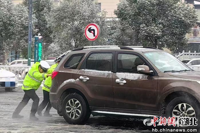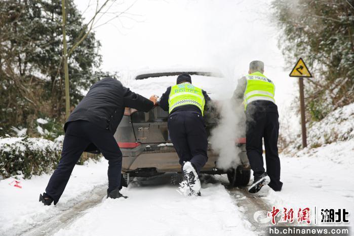 民辅警在远安县茅坪场积雪结冰路段疏导交通。宜昌交警供图