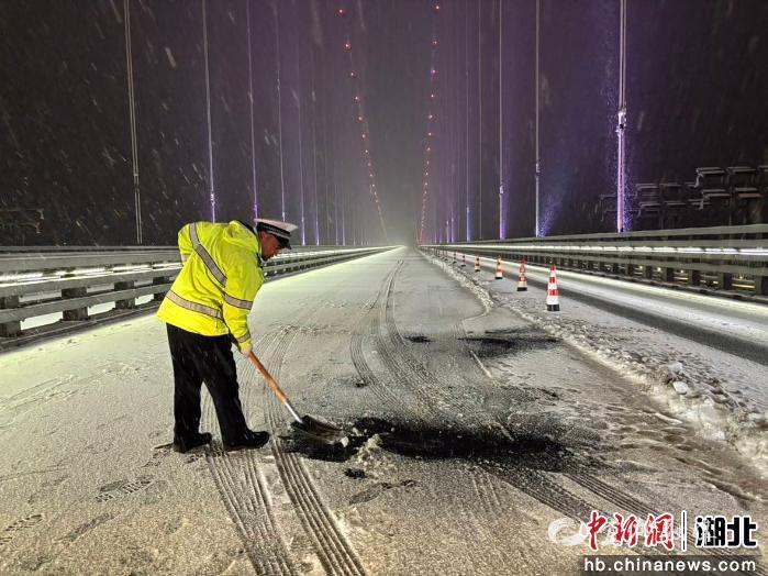 伍家交管民辅警坚守铲雪。宜昌交警供图