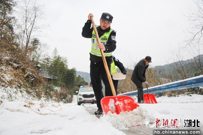 民辅警在远安县茅坪场积雪结冰路段除冰扫雪。宜昌交警供图