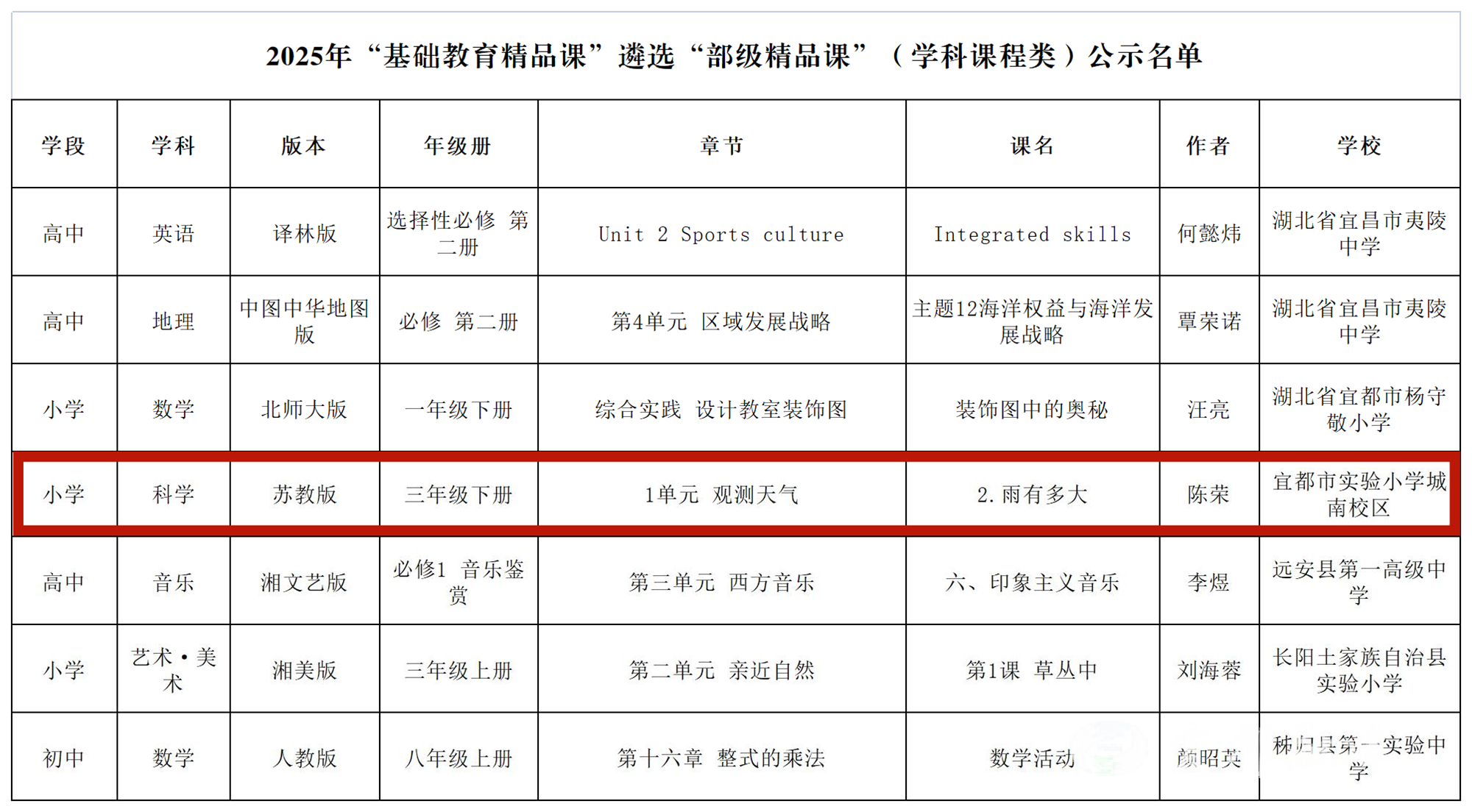 宜都融媒讯(通讯员 曾禹)近日,教育部2025年“基础教育精品课”遴选结果公布,宜都市实验小学城南校区青年骨干教师陈荣执教的小学科学课《雨有多大》成功获评“部级优课”。值得关注的是,陈荣老师不仅是此次宜昌市小学科学学科唯一获此殊荣的教师,更实现了宜都市该学科部级优课的再度突破,为宜都教育事业再添重磅荣誉。