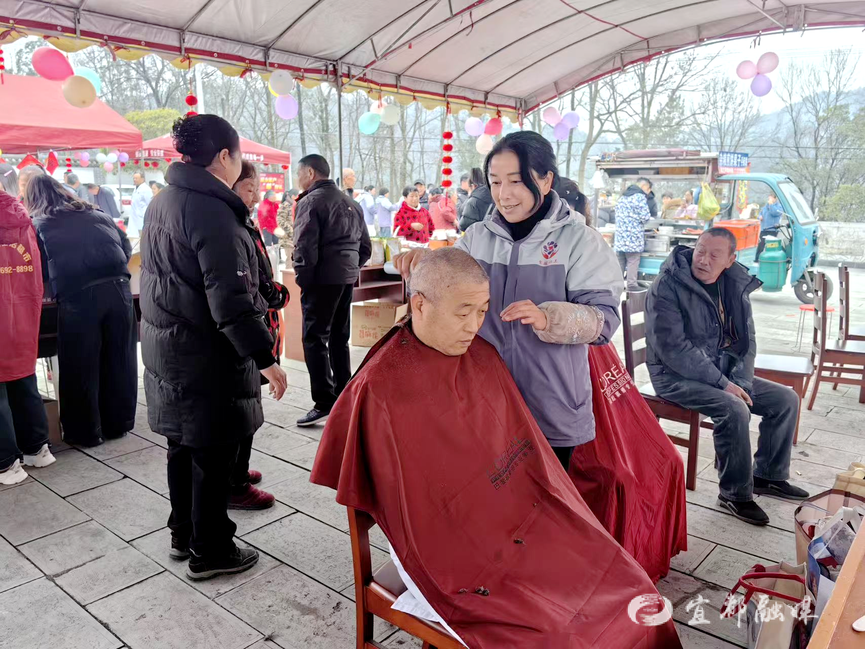 年货节现场暖意融融、亮点纷呈,传统年俗与环保理念、志愿服务交相辉映。积分兑换区里,“20元+80积分即可换购优质有机肥”的兑换模式,让环保理念落地生根;炒货摊位前,现炒瓜子和花生的香气弥漫全场;免费理发、写春联服务点前,村民有序排队,收获满满的新春关怀。与往年不同,今年年货节新增小荷志愿服务队优秀志愿者表扬仪式,首批积极投身“双龄守护”和环保服务的志愿者们登台,用榜样力量传递文明温度。