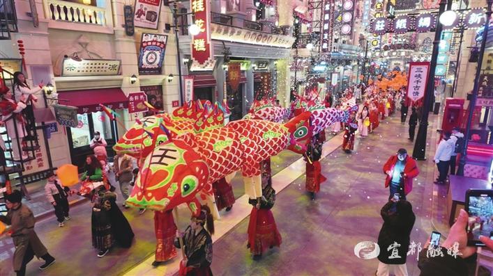 2月7日,宜都市三峡千古情景区,一场融合非遗技艺与三峡民俗的“国潮非遗”活动举行。图为《一夜鱼龙舞》节目现场,上百人的鱼灯队伍巡游,宛如一条璀璨的星河在景区流淌,绘就“鱼影漫峡江”的诗意画卷。