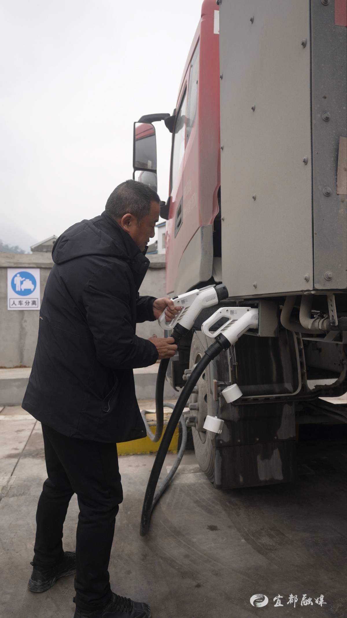 司机熊照正在给他的重型半挂车充电。湖北日报全媒记者 夏晓君 摄