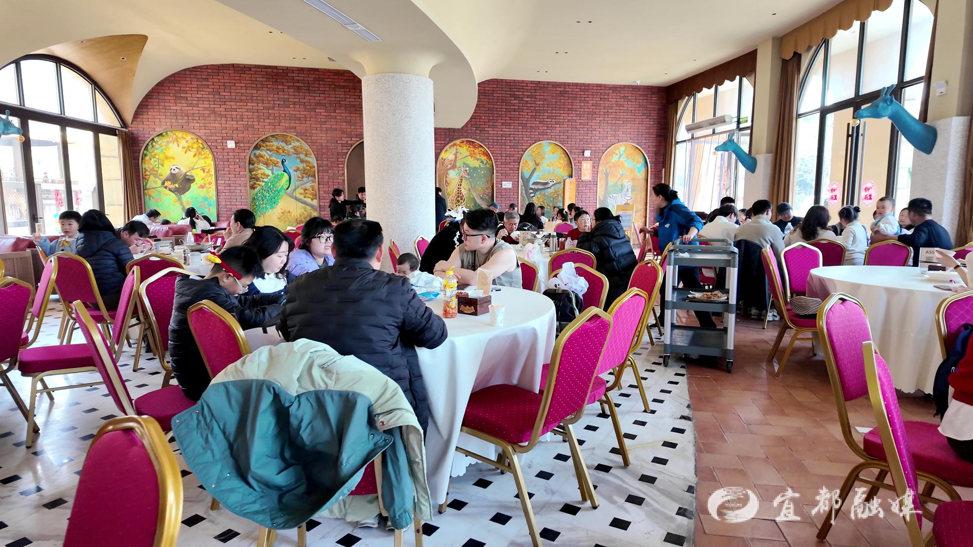 三峡长颈鹿乐园内张灯结彩,年味十足,游客们与长颈鹿亲密互动,园区经典互动游戏“愤怒的小鸟”深受欢迎,游客们通过投掷弹弓参与游戏,赢取惊喜礼品盲盒,现场欢呼声与喝彩声此起彼伏。园区餐厅人气爆棚,游客们围坐一起品特色美食、拍新春美照,欢声笑语不断。