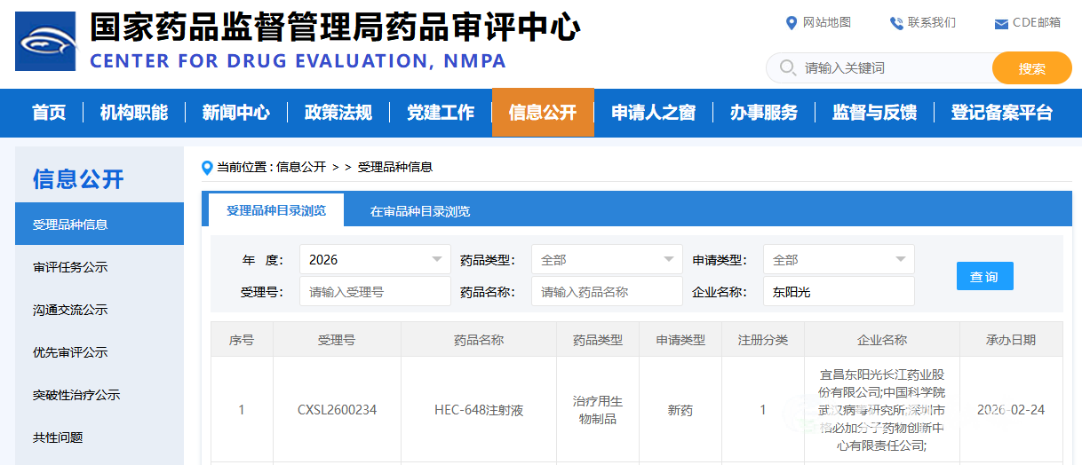 国家药品监督管理局药品审评中心受理品种截图。