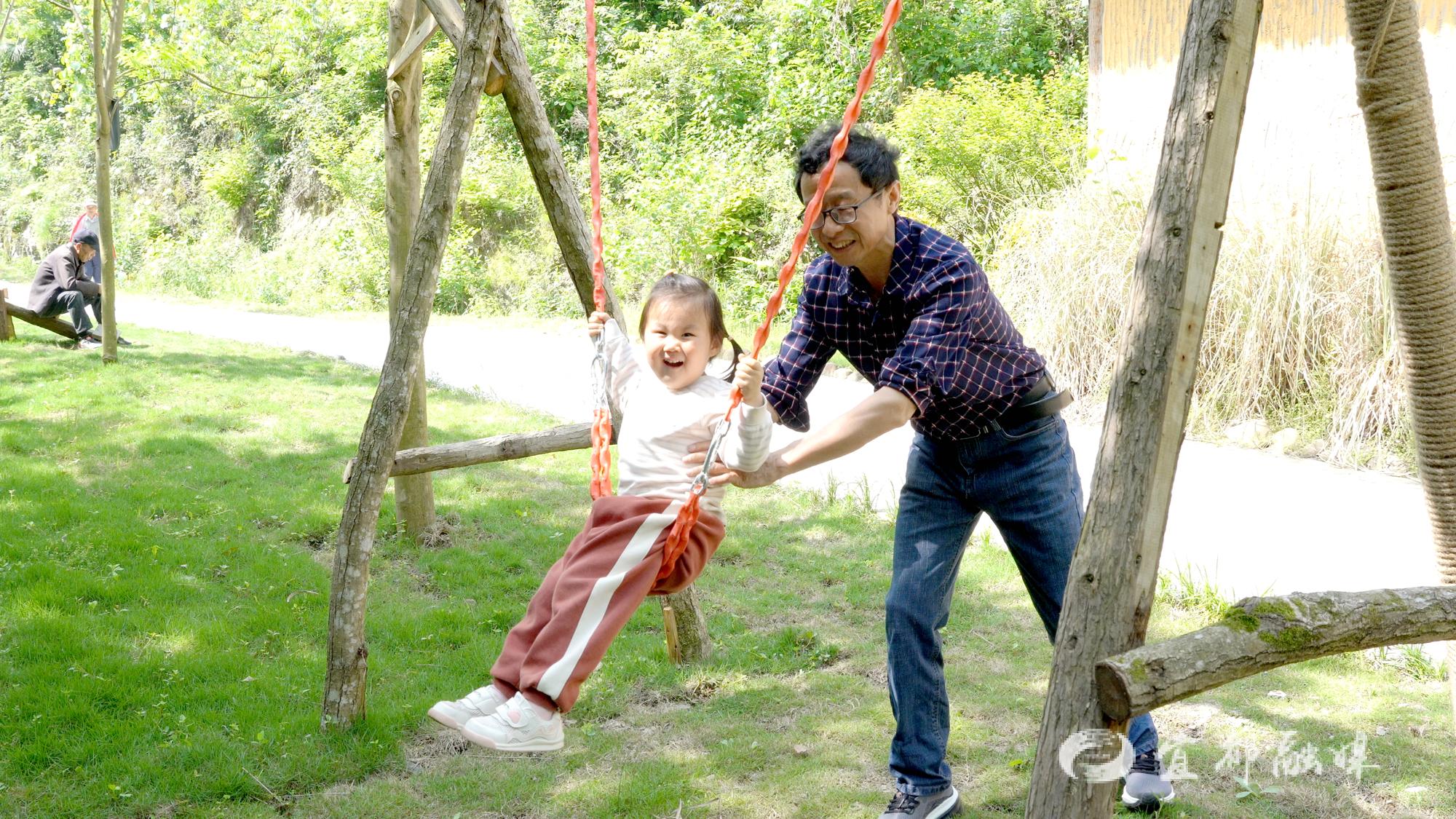 游客王聪笑着说:“我今天主要是带小朋友过来玩,这里面有秋千、跷跷板,旁边蛮多绿植,有阴凉的地方,这一点我觉得特别好。(整体)环境比较优美,比较幽静,给人感觉就比较放松。”